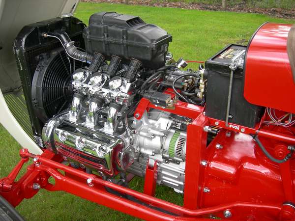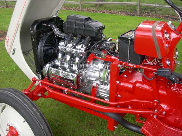 Having completed several engine conversions in the Ford 8-N tractors I decided to do one more. I wanted to do something as unusual as I could think of. I explored a Jaguar dual overhead cam 6 cylinder engine, a BMW 6 cylinder engine, and a Porsche and Corvair horizontal opposed six cylinder engine. Then during casual conversation one evening on our way to a club meeting with my good friend and fellow engineer Greg Koesel I told him of my plans. He immediately mentioned "Have you considered a flat six motorcycle engine"? I said no I did not give that a consideration.