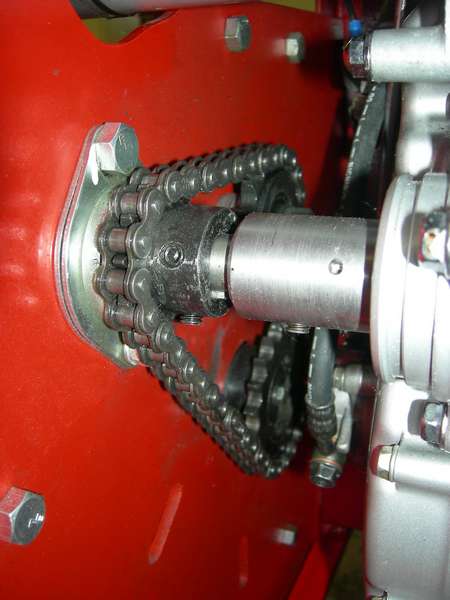 The first order of business was to take all measurements and begin frame construction. Most of the framework was constructed from 2" X 2" and 2" X 4" X 1/8" wall tubing. The adapter plate and front axle mount were constructed of ¼" plate. One fault I have is that I hold too tight of tolerance so there was some rework along the way. I do believe in measuring twice and cutting once. Since the Valkyrie was originally driven with a driveshaft I designed a drive system that utilized a chain and sprocket system using # 40 roller chain for input into the tractor transmission. Knowing I would have 20 forward speeds ( 5 on the engine times 4 in the tractor = 20) I estimated I would need a 4:00 to 1:00 sprocket ratio with 4:00 ratio on the engine drive and 1:00 ratio on the tractor transmission. Once the drive system and frame configuration were completed the entire tractor was disassembled and sandblasted. After that task was complete painting the individual parts for reassembly was begun. All worn parts were replaced with new components.